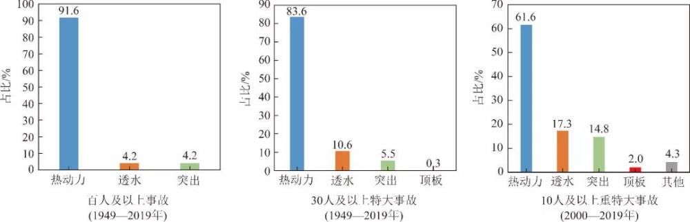 1科學(xué)問題的提出為認(rèn)識煤礦熱動(dòng)力重特大事故的發(fā)生規(guī)律,王德明教授對我國2000—2019年一次死亡10人及以上的509起煤礦重特大事故、1949—2019年一次死亡30人及以上的302起煤礦特大事故和24起一次死亡百人以上事故進(jìn)行了統(tǒng)計(jì)與分析,結(jié)果表明熱動(dòng)力災(zāi)害在煤礦重特大事故中占比最高、致災(zāi)最嚴(yán)重。