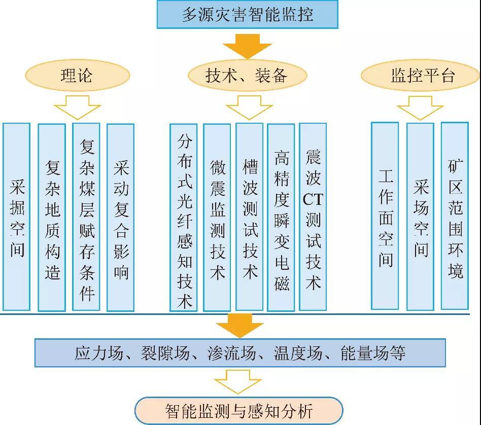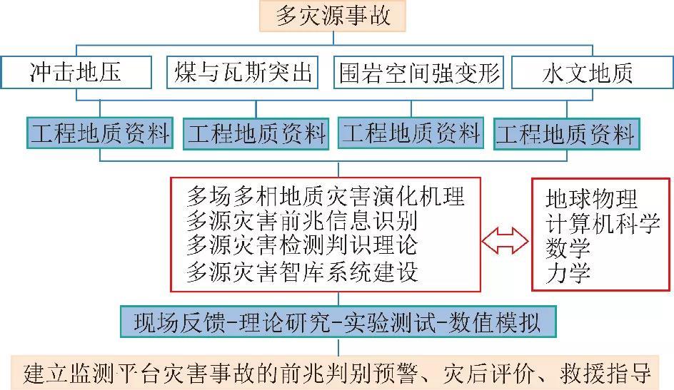其二,通過動態(tài)地質(zhì)模型獲取掘采工程擾動效應影響下,原生靜態(tài)地下空間地質(zhì)條件發(fā)生變形與破壞,由此而引起的應力應變場、地質(zhì)地球物理場、滲流場、溫度場、濃度場等狀態(tài)發(fā)生改變的參量特征;以及工程動力學作用下,生產(chǎn)環(huán)境周邊巖層的離層、裂隙、垮落、圍巖失穩(wěn)、底臌、沖擊地壓顯現(xiàn)、應力集中與釋放、煤與瓦斯涌突、突水潰沙等多種災害源現(xiàn)象的動態(tài)地質(zhì)信息變化量值。