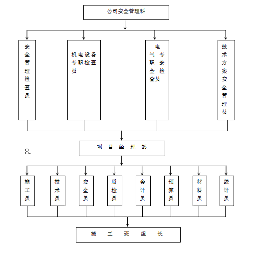 (3)項(xiàng)目部工程師:主持制定工程項(xiàng)目的安全技術(shù)措施和各分項(xiàng)工程的安全方案,督促安全措施落實(shí),解決施工過程中的不安全的技術(shù)問題。