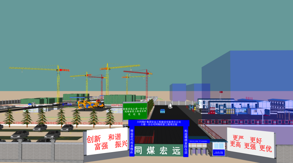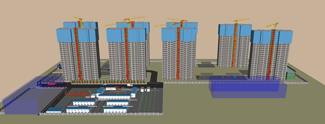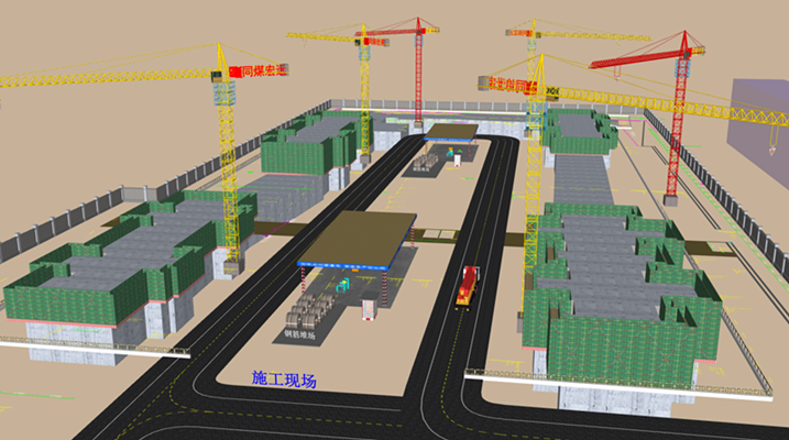 通過運用廣聯(lián)達場布軟件創(chuàng)建了建筑模型以及場地模型,并將工程周邊及現(xiàn)場的實際環(huán)境信息放到模型中,建立直觀的三維施工場地平面布置模型。參照工程進度計劃,形象直觀地模擬各個階段的現(xiàn)場情況,靈活地進行現(xiàn)場平面布置,實現(xiàn)現(xiàn)場平面布置合理、高效。通過將施工現(xiàn)場中的臨設、生產(chǎn)操作區(qū)域、辦公生活區(qū)、材料堆放區(qū)等以動態(tài)的方式進行合理布局,優(yōu)化施工場地布置方案,模擬大型機械的安裝使用覆蓋范圍,提高現(xiàn)場機械設備的覆蓋率,降低運輸費用及材料二次搬運成本。