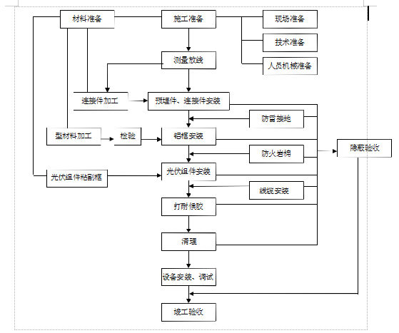 方案設(shè)計→部件加工、購置→預(yù)埋件安裝→光電施工準(zhǔn)備→測量放線→光電器材安裝→玻璃光伏幕墻施工→線纜安裝→設(shè)備就位→系統(tǒng)運(yùn)行(工藝流程圖,見下圖)