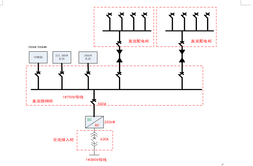 通過直流控制柜接入綜合樓231.08kWp光伏系統(tǒng),預(yù)留試驗(yàn)樓200kW光伏接入,接入250kW/500kWh儲能系統(tǒng),輸出至直流配電柜,通過直流配電柜接入負(fù)二層至八層的直流照明壁掛電源和照明配電箱,以及室外的景觀照明和城市家具配電箱及10臺直流充電樁,負(fù)荷約450kW。