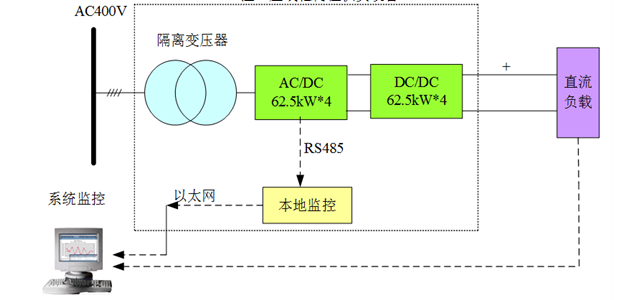 PWS2-250K/500K由4個62.5KW AC/DC,4個DCDC模塊單元、控制單元、監(jiān)控單元等組成。