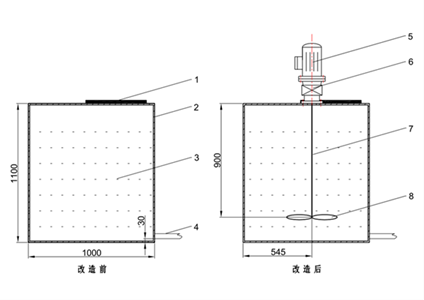 我們收集了相關(guān)資料,構(gòu)思了增加刮板機、機械攪拌、磁力攪拌、鼓風(fēng)攪拌這4種方法來解決該問題,根據(jù)現(xiàn)場實際情況,討論后決定選用增加機械攪拌的方式來防止溶液沉淀,在原儲液罐的頂部安裝了一臺機械攪拌裝置。