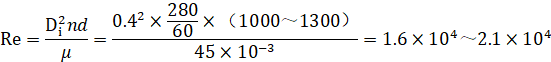 從渦輪葉輪的使用情況看,葉輪直徑/罐直徑大體為0.25~0.5,轉(zhuǎn)速大約在50~300r/min的范圍適應(yīng)的流體粘度最高達(dá)30Pa·s。