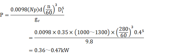 當(dāng)Re> 104時,罐內(nèi)為湍流,Np幾乎是一個定值。查Np與Re關(guān)系圖得Np=0.35。