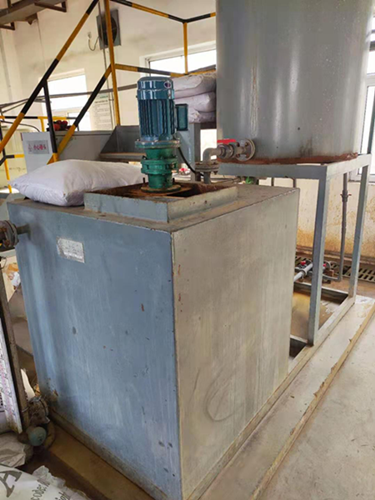 我們在生產(chǎn)中發(fā)現(xiàn)藥液在儲液箱內(nèi)容易發(fā)生沉淀,導(dǎo)致藥液固體濃度降低,污水脫泥效果不佳;并且藥液沉淀會結(jié)塊堵塞加藥管道和液位計,一段時間后會在儲液箱底部板結(jié),需要頻繁清理儲液箱底部沉淀。