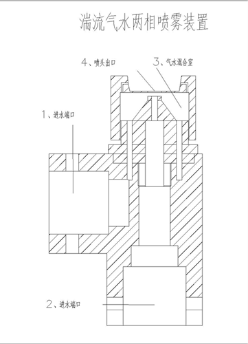 利用湍流技術(shù)將高壓水源用氣源進(jìn)行霧化,前置水壓穩(wěn)壓系統(tǒng)和氣壓穩(wěn)壓系統(tǒng),分別將水源和氣水源進(jìn)行霧化前的穩(wěn)壓,保證霧化水源的氣源的穩(wěn)定性。