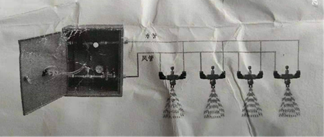 通過(guò)氣水噴霧連桿將風(fēng)管和水管分別連接在兩個(gè)噴霧桿上,一個(gè)供水,一個(gè)供風(fēng)。同時(shí)用風(fēng)水管路上的閥門(mén)調(diào)節(jié)風(fēng)水兩相裝置供風(fēng)和供水。