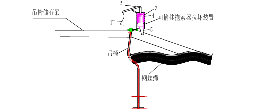 如圖一所示,該零速上下車裝置和吊椅儲存裝置由吊椅儲存梁、人員乘坐臺、可摘掛抱索器拉壞裝置等組成。1-2段為下坡段,拉動抱索器拉環(huán)裝置后抱索器靠自重和人的重量下滑,2為鋼絲繩和鋼梁交叉點(diǎn),抱索器從鋼梁依靠慣性滑至鋼絲繩上,并和鋼絲繩卡死;2-3段鋼絲繩牽引抱索器向前方行走;3-4段為上坡段,3為鋼絲繩和鋼梁交叉點(diǎn),抱索器和鋼絲繩分離并滑上鋼梁,抱索器由于自重、人的重量、摩擦力速度逐漸減降為零;4-5段為儲存吊椅段,人下車后將抱索器推至4-5中間段方便下次乘坐。