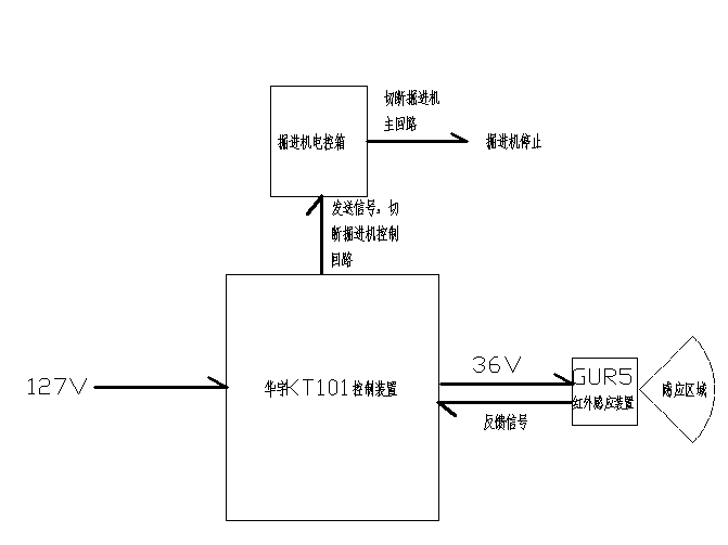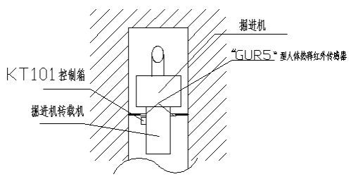 當(dāng)人體誤入紅外感應(yīng)區(qū)域時(shí),“GUR5”型人體熱釋紅外傳感器自動(dòng)探測(cè)人體發(fā)射的7-10um左右的紅外線,將給華宇控制箱中的繼電器一個(gè)電流信號(hào),該信號(hào)的切入能使控制箱中的斷電器工作,斷開(kāi)控制系統(tǒng)中控制掘進(jìn)機(jī)開(kāi)停的閉鎖控制回路,從而達(dá)到停止掘進(jìn)機(jī)主回路的目的,掘進(jìn)機(jī)停止運(yùn)轉(zhuǎn),保障了人員的安全。