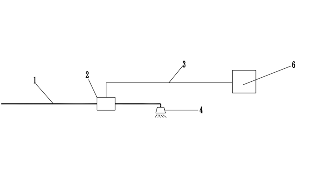 如圖1所示,一種皮帶運(yùn)輸機(jī)旁的自動(dòng)噴霧灑水裝置,包括設(shè)置有電磁閥2的水管1,所述水管1的端部連接有若干個(gè)噴頭4,所述噴頭4位于皮帶運(yùn)輸機(jī)的皮帶5上方,所述電磁閥2通過電纜3與皮帶運(yùn)輸機(jī)的保護(hù)用電控箱6的一組常開觸點(diǎn)連接且與保護(hù)用電控箱6的36V電源串聯(lián)。