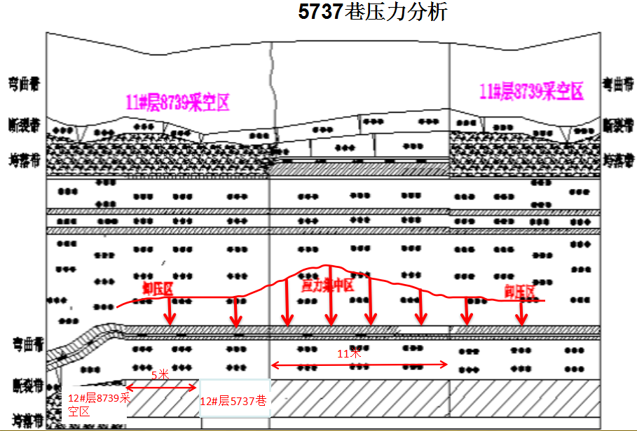 12#層5737巷壓力來源主要受上覆11#層8739面采空區(qū)和11#層8737面采空區(qū)中間保護(hù)煤柱壓力與同層12#層8739面回采動壓多重壓力影響。