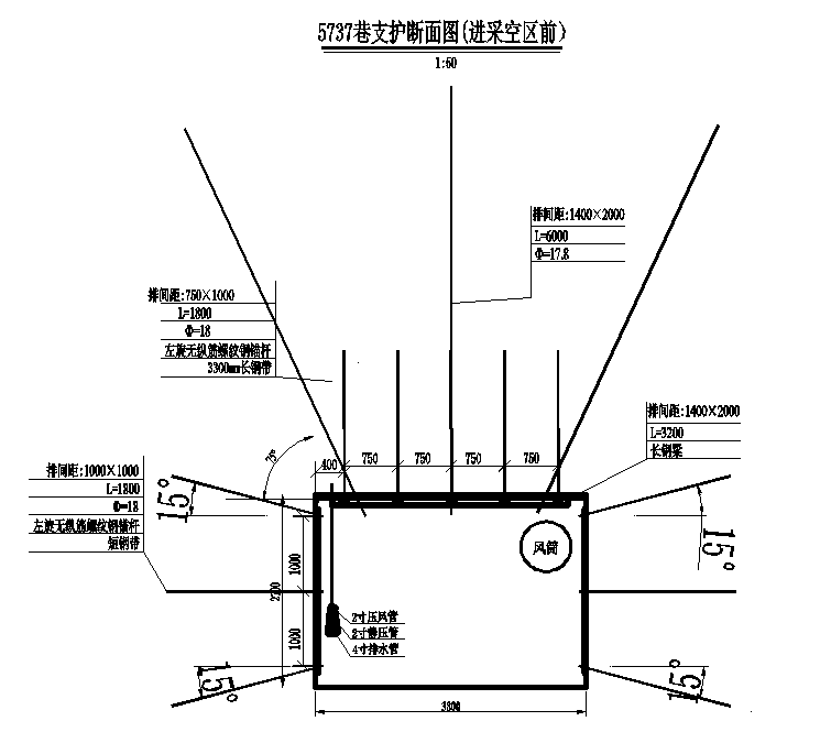 圖3 12#層307盤區(qū)5737巷進(jìn)入采空區(qū)前支護(hù)斷面圖