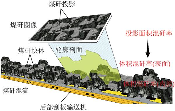 混矸率是一個(gè)廣義的概念,不僅可以用投影面積比表示,還可以用表面積比或者體積比表示。通過(guò)統(tǒng)計(jì)二維圖像中像素點(diǎn)個(gè)數(shù),可以得到用投影面積表示的混矸率。實(shí)際上,放頂煤工作面后部刮板運(yùn)輸機(jī)上煤流中的煤和矸石是三維塊體,且相互疊壓堆積,所以,通過(guò)煤矸二維圖像反演煤矸塊體三維堆積形態(tài),獲得煤流表面的體積混矸率,并且對(duì)疊壓在煤流內(nèi)部的體積混矸率進(jìn)行預(yù)測(cè),這是一種提升混矸率測(cè)量精度的方法,也是圖像識(shí)別智能放煤技術(shù)有別于且領(lǐng)先于其他監(jiān)測(cè)手段或方法的地方,這將在后面幾節(jié)展開(kāi)介紹。