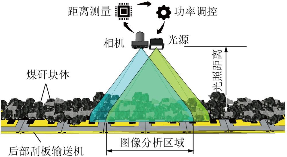 因此,我們提出了一種基于立體視覺(jué)的照度智能監(jiān)測(cè)與自適應(yīng)調(diào)節(jié)方法,為圖像識(shí)別智能放煤技術(shù)提供最優(yōu)照度。在放頂煤工作面,利用圖像深度信息確定光照距離,配合功率監(jiān)測(cè)確定實(shí)時(shí)照度,進(jìn)而通過(guò)調(diào)節(jié)功率獲得最佳照度,然后在最佳照度下對(duì)圖像進(jìn)行采集和識(shí)別,實(shí)現(xiàn)了圖像識(shí)別智能放煤過(guò)程中的照度自適應(yīng)調(diào)節(jié)。實(shí)際上,如果相機(jī)和光源并列放置,那么可以直接用圖像深度近似代替光照距離。而如果分散布置,則也可以通過(guò)幾何關(guān)系換算確定光照距離。