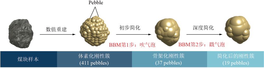 為了區(qū)別于精準(zhǔn)重建方法,將這種方法稱為寫(xiě)意重建,寫(xiě)意重建又有別于完全隨機(jī)的重建,因?yàn)樗窃谛螤钐卣鲄?shù)的主動(dòng)干預(yù)下完成的重建,所以具有一定可重復(fù)性和科學(xué)性。重建后的塊體是由若干pebble組成的體素化剛性簇,體素化剛性簇的分辨率(或體素尺寸)影響到塊體細(xì)節(jié)表征效果,分辨率越高(即體素尺寸越小),細(xì)節(jié)表征越好,但用到的pebble數(shù)量也越多,會(huì)在一定程度上影響運(yùn)算效率;反之分辨率越低,犧牲了部分細(xì)節(jié)特征,但是有利于提高運(yùn)算效率。因此如何在保證重建精度的前提下,有效減少pebble數(shù)量,是提高運(yùn)算效率的關(guān)鍵。為此,提出了一種有效的方法來(lái)優(yōu)化完善上述重建過(guò)程,即氣泡破裂法(Bubble burst method, BBM),主要包括吹氣泡和戳氣泡兩個(gè)過(guò)程。