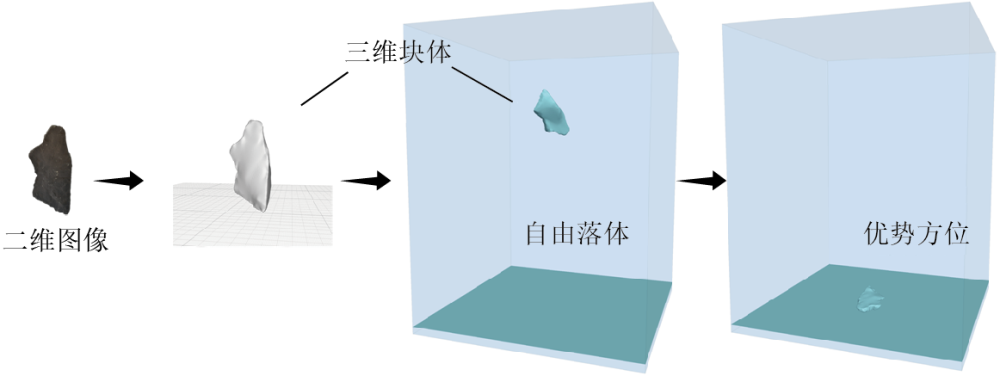 二維形態(tài)特征與圖像采集的視角有關(guān),即不同視角下的煤矸塊體的二維形態(tài)特征不同,所以,在分析煤矸塊體二維特征的時(shí)候,需要首先確定觀察視角。在放頂煤工作面,從放煤口放出煤矸塊體在經(jīng)過(guò)放落、碰撞后,會(huì)傾向于以優(yōu)勢(shì)方位(Preferred orientation)堆積在后部刮板運(yùn)輸機(jī)上。因此,有必要確定對(duì)后部刮板輸送機(jī)上的煤矸塊體的觀察視角,而不是隨意觀察,在優(yōu)勢(shì)方位下提取的形狀特征才有意義?;谶@一假設(shè),利用多視圖像序列精準(zhǔn)重建了煤矸塊體模型,用離散元法進(jìn)行了自由落體數(shù)值計(jì)算,確定了具有不同形狀特征參數(shù)塊體的優(yōu)勢(shì)方位。