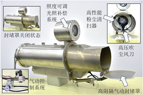 吸附在相機(jī)鏡頭上的吸附塵,主要包括吸附煤塵和吸附巖塵。對(duì)于這類(lèi)粉塵的處理,圍繞井下惡劣環(huán)境開(kāi)展技術(shù)攻關(guān),并與安徽中科光電色選機(jī)械有限公司合作,于2020年研制出能夠適應(yīng)井下高濃度粉塵、水霧環(huán)境、具有數(shù)據(jù)獨(dú)立處理功能的圖像采集系統(tǒng)第一代原理樣機(jī)—“慧眼一號(hào)(Insight-I)”?;谌梭w仿生學(xué)以及邊緣AI技術(shù),分別模仿眨眼、揉眼、吹灰等動(dòng)作,通過(guò)高阻隔氣動(dòng)封堵罩、高性能粉塵清掃器、高壓吹塵風(fēng)刀,實(shí)現(xiàn)圖像采集系統(tǒng)粉塵自主感知與清除功能,并實(shí)現(xiàn)了在圖像采集端完成數(shù)據(jù)處理工作,降低了數(shù)據(jù)傳輸壓力,提升了系統(tǒng)可靠性和響應(yīng)速度。