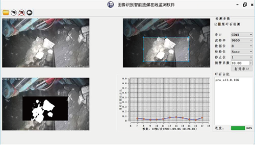 基于上述圖像識(shí)別智能放煤技術(shù)基本原理,進(jìn)一步研發(fā)了圖像識(shí)別智能放煤在線監(jiān)測(cè)軟件,圖像處理速度25幀/s,實(shí)時(shí)計(jì)算混矸率數(shù)據(jù),當(dāng)混矸率超過(guò)預(yù)定的區(qū)間混矸率閾值時(shí),通過(guò)通信模塊自動(dòng)發(fā)送中止放煤或者關(guān)閉當(dāng)前放煤口、開(kāi)啟下一放煤口的指令給控制系統(tǒng)。