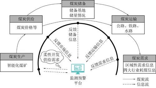 研究定義煤炭智能柔性開(kāi)發(fā)供給體系為:將新一代信息技術(shù)與煤炭開(kāi)發(fā)、運(yùn)輸、倉(cāng)儲(chǔ)、需求預(yù)測(cè)等進(jìn)行深度融合,建立以數(shù)字化為基礎(chǔ)、智能化賦能的多層次網(wǎng)狀煤炭開(kāi)發(fā)供應(yīng)鏈,實(shí)現(xiàn)對(duì)煤炭需求的超前精準(zhǔn)預(yù)測(cè),并基于預(yù)測(cè)結(jié)果對(duì)煤炭生產(chǎn)、運(yùn)輸、倉(cāng)儲(chǔ)等進(jìn)行自動(dòng)智能優(yōu)化調(diào)節(jié),實(shí)現(xiàn)煤炭資源安全、高效、穩(wěn)定、柔性供給。