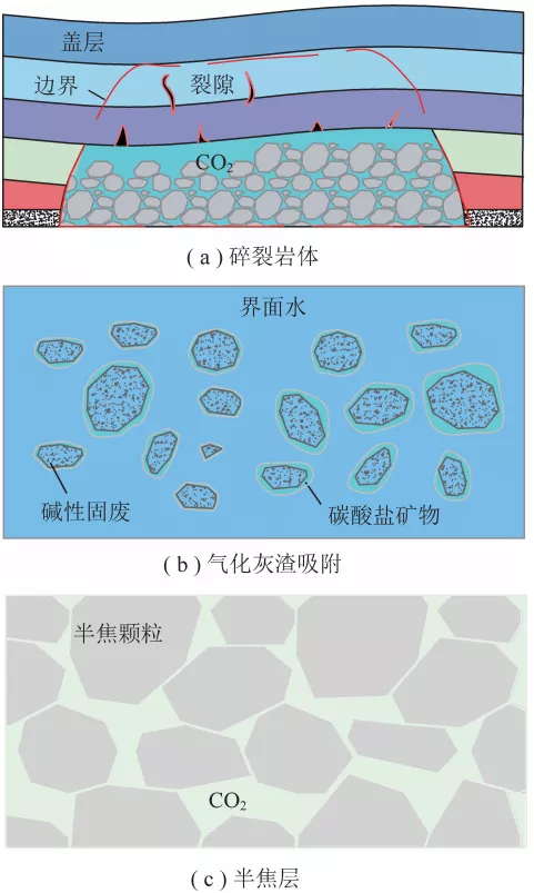 根據(jù)上述思路,王雙明院士在對煤炭開采擾動空間地質(zhì)特點分析的基礎(chǔ)上,探究了煤炭開采擾動空間高效封存CO2的必備條件,提出了適宜于煤礦開采過程中進行CO2封存的3種潛在技術(shù):煤層采空區(qū)碎裂巖體CO2封存技術(shù)、煤地下氣化煤灰及碎裂巖體CO2封存技術(shù)、煤原位熱解半焦CO2封存技術(shù),并分別對上述技術(shù)對應(yīng)的封存理念、技術(shù)途徑及技術(shù)難題進行了討論。