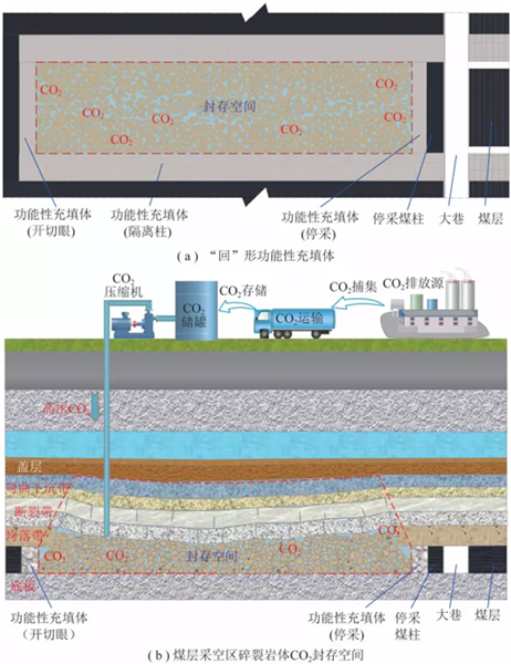 在進行CO2地下封存時,往往選擇埋深>1000m的深部地層,并通過壓力控制使CO2處于超臨界狀態(tài)實現(xiàn)大規(guī)模封存,但這會導(dǎo)致壓注阻力較大、封存成本偏高。在本研究中,通過論證得出:無論何種CO2封存類型,即使儲存載體、儲存埋深及稟賦地層條件等有所差異,其共性條件均具有良好的地質(zhì)蓋層。即在煤礦開采區(qū),只要滿足不受開采擾動影響的穩(wěn)定地質(zhì)蓋層和良好儲集空間密閉性即可實現(xiàn)采空區(qū)CO2封存,與地層埋深關(guān)系并不十分密切。事實上,埋深≤1000m的中淺部地層在具備良好的“儲+蓋”地質(zhì)組合條件時,同樣可實現(xiàn)CO2規(guī)?;獯妗R虼?,本次研究提及的煤炭開采擾動空間系指中淺部煤層(埋深≤1000m)開采過程中形成的地下采空區(qū)及其擾動影響范圍區(qū)。研究明確了實現(xiàn)CO2地下高效封存的必備條件:①煤層上部存在不受開采擾動影響的地質(zhì)密閉層是實現(xiàn)煤礦擾動空間CO2封存的先決要求;②構(gòu)建功能性充填空間是實現(xiàn)CO2地下封存的核心工作;③由功能性充填體圍限的碎裂巖體、氣化煤灰及熱解半焦等封存載體物性特征是影響CO2封存量及封存效果的重要因素。