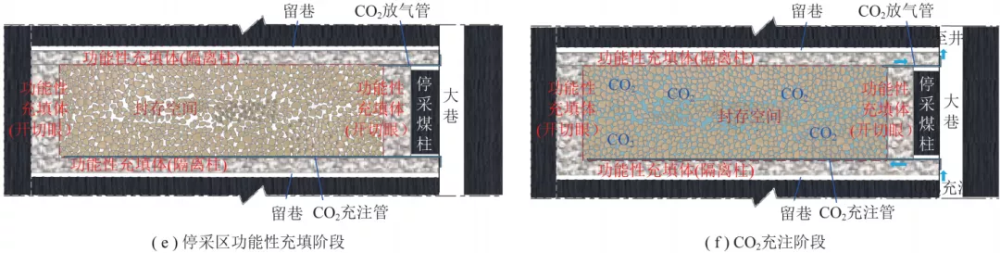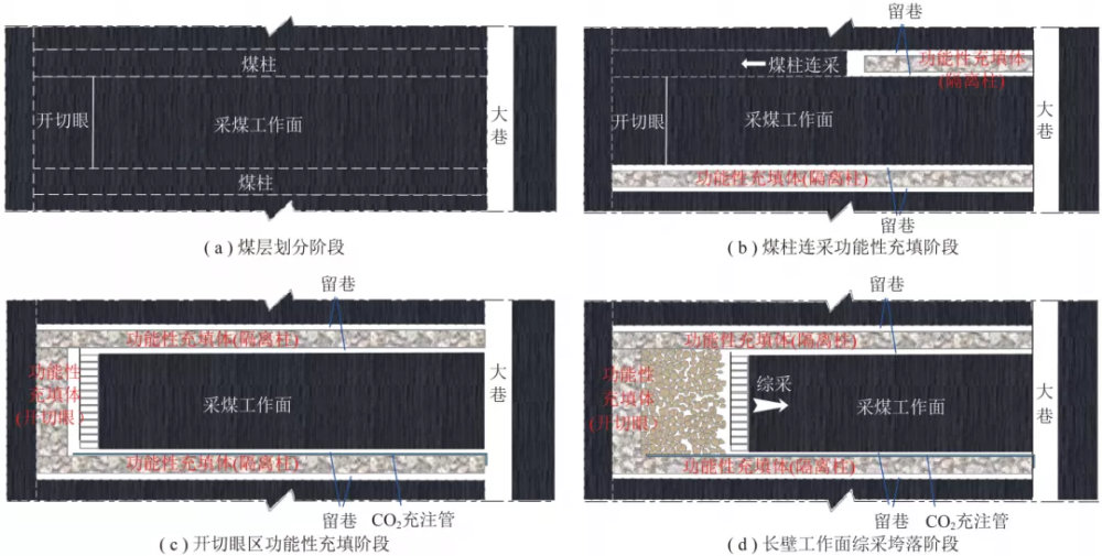 技術(shù)途徑:煤層采空區(qū)碎裂巖體CO2封存技術(shù)分為6個階段,具體包括煤層劃分、煤柱功能性充填回采、開切眼區(qū)充填、長壁工作面垮落開采、停采區(qū)功能性充填和CO2充注階段。