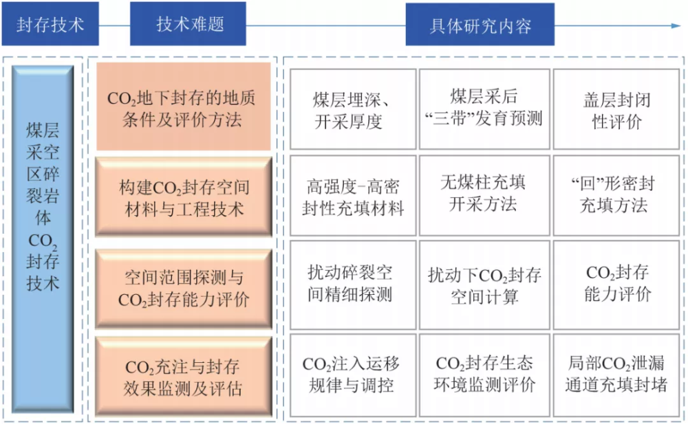 煤層采空區(qū)碎裂巖體CO2封存技術(shù)關(guān)鍵技術(shù)難題:煤層采后CO2蓋層封閉性評價、CO2封存空間構(gòu)筑、擾動空間探測與CO2封存潛力評價、CO2充注調(diào)控與封存效果監(jiān)測及評估。