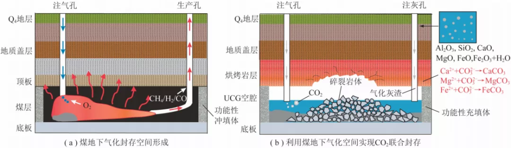 技術(shù)途徑:本研究所提的CO2封存模式是指綜合利用UCG形成的地下空間和殘余物質(zhì)實現(xiàn)的一種以化學(xué)封存(永久封存)為主,兼用物理封存?;瘜W(xué)封存主要是利用氣化灰渣(也可利用發(fā)電廠的粉煤灰)中大量的堿土金屬氧化物水化后的金屬陽離子,與CO2溶于水形成的碳酸根離子發(fā)生碳酸化反應(yīng),生成可用于永久封存的碳酸鹽類物質(zhì);物理封存是利用UCG形成的空腔和上覆巖體垮落物等形成的空隙吸附CO2。
