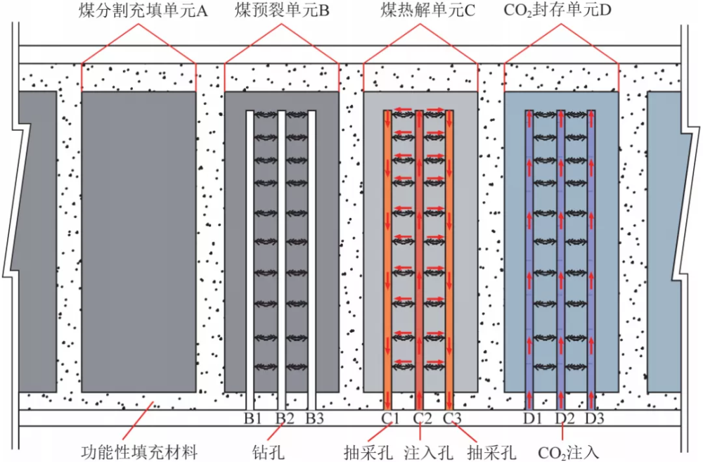 技術(shù)途徑:井工式富油煤原位熱解半焦CO2封存技術(shù)主要包括4個階段:煤層分割充填階段,煤層預(yù)裂階段,煤層熱解階段,CO2充注階段。