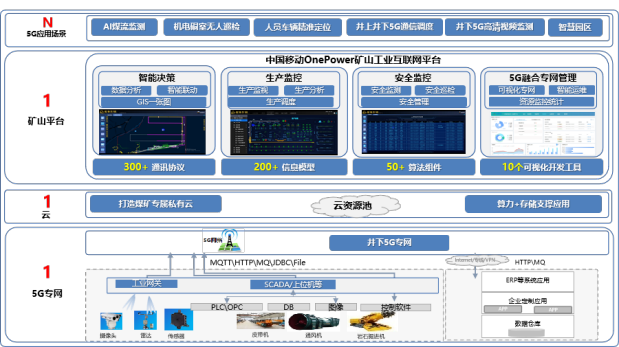中國移動立足5G戰(zhàn)略布局,凝聚行業(yè)力量,植根OnePower工業(yè)互聯(lián)網(wǎng)平臺體系,構(gòu)建行業(yè)領(lǐng)先的智能礦山整體架構(gòu),通過1張行業(yè)專網(wǎng)+1個基礎(chǔ)平臺+N個應(yīng)用場景,實現(xiàn)端到端標(biāo)準(zhǔn)方案交付,即一張礦山專網(wǎng)做“高速通道”,一個OnePower-礦山子平臺做“核心大腦”,一朵礦山私有云做“算力存儲”,6大應(yīng)用做“智能觸點”,平臺對標(biāo)國家能源局智能化示范煤礦驗收管理辦法,可實現(xiàn)接入礦山設(shè)備并集成礦山各業(yè)務(wù)子系統(tǒng)、合作伙伴創(chuàng)新應(yīng)用,實現(xiàn)有效整合、集中管控,及時處理、指導(dǎo)和調(diào)節(jié)礦山各生產(chǎn)系統(tǒng)和環(huán)節(jié)運行,為客戶實現(xiàn)對礦山工業(yè)全要素監(jiān)控和輔助決策,重點場景“少人化”、一般場景“無人化”,壓降生產(chǎn)成本,降低安全隱患。