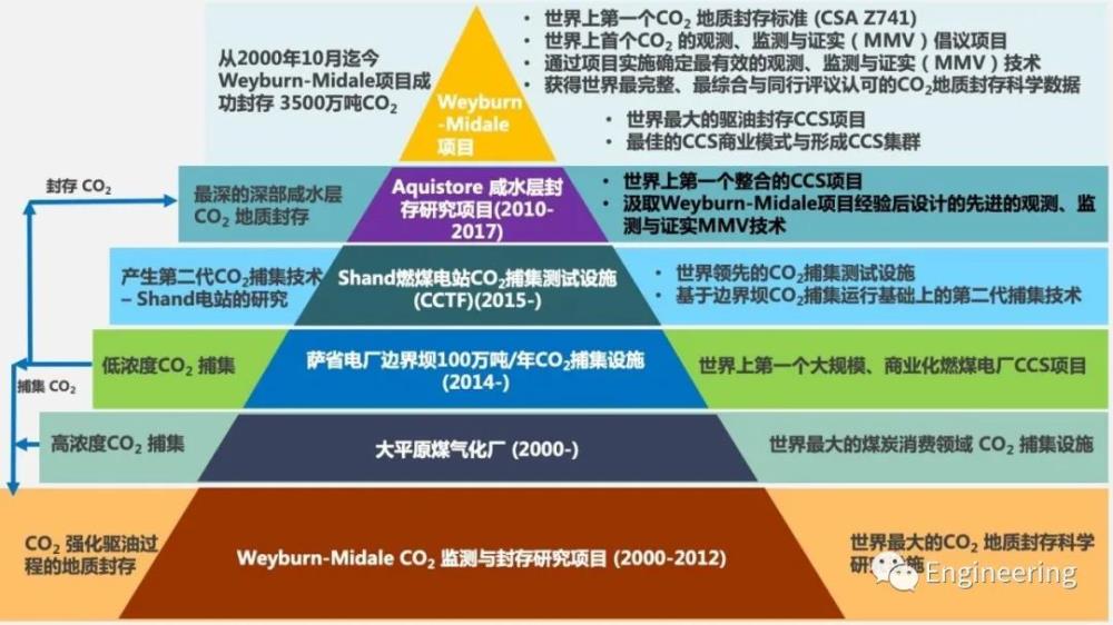 在CCS關(guān)鍵技術(shù)研發(fā)與示范中,西北大學(xué)的馬勁風(fēng)教授研究團(tuán)隊(duì)認(rèn)為先進(jìn)國家CCS科技基礎(chǔ)研究設(shè)施的建立,成為其CCS技術(shù)源頭創(chuàng)新、成本降低、風(fēng)險(xiǎn)降低、商業(yè)化推廣及人才培養(yǎng)的源泉。因此在分析對(duì)比國際CCS科技基礎(chǔ)研究設(shè)施特點(diǎn)的基礎(chǔ)上,重點(diǎn)分析了加拿大Weyburn-Midale項(xiàng)目從高濃度世界最大規(guī)模煤化工CO2捕集,到低濃度世界最大燃煤電廠年百萬噸CO2捕集的實(shí)施歷程與技術(shù)創(chuàng)新(圖1)。
