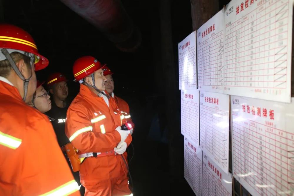 到礦后,胡海軍一行直奔安全生產(chǎn)指揮中心,認(rèn)真查看玉溪煤礦采掘平面、瓦斯地質(zhì)和抽采系統(tǒng)等圖紙,仔細(xì)翻閱瓦斯抽采與防治各類數(shù)據(jù)登記臺賬,詳細(xì)詢問采掘布置、瓦斯抽采和防突措施等瓦斯治理情況、采掘接續(xù)及近期安全生產(chǎn)情況。隨后親自帶隊(duì)深入井下1304底抽巷、1302工作面及1301綜采工作面等采掘作業(yè)一線,督導(dǎo)檢查瓦斯治理、生產(chǎn)組織、現(xiàn)場安全管理、安全生產(chǎn)標(biāo)準(zhǔn)化建設(shè)及各項(xiàng)安全措施落實(shí)情況。
