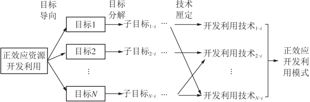 以正效應(yīng)作為模式研究的對象,秉承“目標(biāo)導(dǎo)向”思路,厘定適宜的子目標(biāo),并以可行的技術(shù)為支撐,形成發(fā)揮正效應(yīng)資源潛力和價(jià)值的技術(shù)模式。其研究內(nèi)容分為目標(biāo)導(dǎo)向與子目標(biāo)分解、模式技術(shù)厘定及模式構(gòu)成3部分。首先選定適宜的一個(gè)或多個(gè)開發(fā)利用目標(biāo),將每個(gè)目標(biāo)分解為數(shù)個(gè)可行的子目標(biāo),厘定子目標(biāo)適宜的技術(shù)方法,最后優(yōu)化、組合技術(shù)構(gòu)建正效應(yīng)開發(fā)利用模式(圖1)??梢钥闯?,從目標(biāo)到模式的過程中間出現(xiàn)了一對一、一對多、多對多等映射關(guān)系,而模式理論和實(shí)踐研究的意義則在于探索如何通過開發(fā)利用技術(shù)的有機(jī)組合來實(shí)現(xiàn)正效應(yīng)開發(fā)利用潛力的最大化。