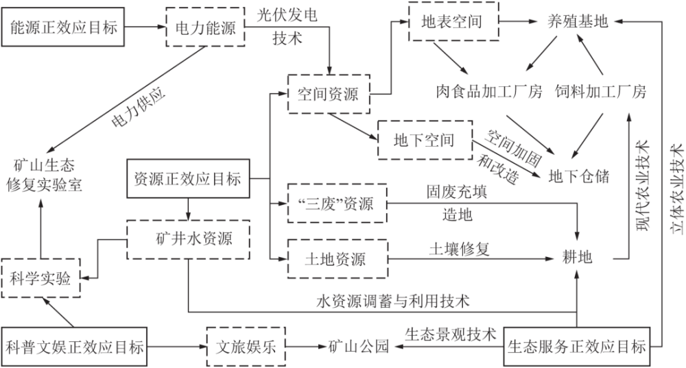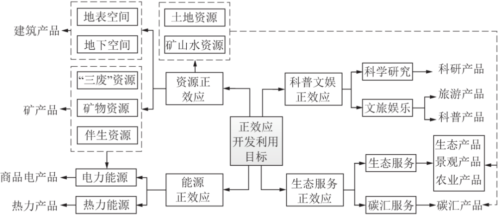 (1)資源正效應(yīng)目標(biāo)。資源正效應(yīng)包括土地資源、空間資源、殘留資源及“三廢”資源,其開發(fā)利用可擴(kuò)充現(xiàn)有資源量,減少資源損失和浪費(fèi)。土地資源包含未擾動(dòng)的土地和受損修復(fù)(恢復(fù))的2類土地,可緩解城鎮(zhèn)土地資源緊缺,解決土地資源供需矛盾;空間資源指礦業(yè)工程活動(dòng)直接或間接形成的地表和地下空間;殘留資源包括礦山水資源、伴生資源以及舊采殘留資源,其開發(fā)可降低資源勘探和開發(fā)成本,減少資源浪費(fèi)及環(huán)境污染;“三廢”資源是指礦業(yè)活動(dòng)的廢棄物和副產(chǎn)物中提取和釋放的有用的固、液、氣三相資源,如煤矸石、酸性礦井水、沼氣等。