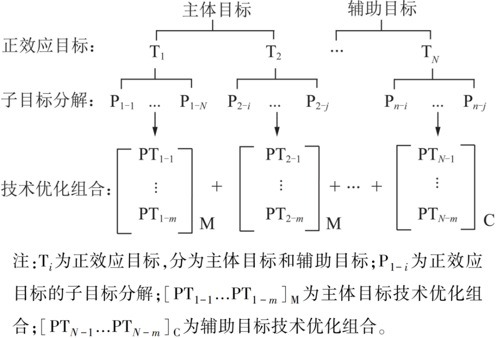 根據(jù)正效資源的屬性,可選目標(biāo)往往不唯一,且目標(biāo)與子目標(biāo)具有一對多的映射關(guān)系。為了明確模式的差異化特征,在目標(biāo)的倒逼下就需要選擇適宜的主體與輔助目標(biāo)之下的子目標(biāo)及其技術(shù)方法,并將這種優(yōu)化組合構(gòu)建為正效應(yīng)開發(fā)利用模式,使技術(shù)方法的效益得以最優(yōu)表達(dá)(圖3)。