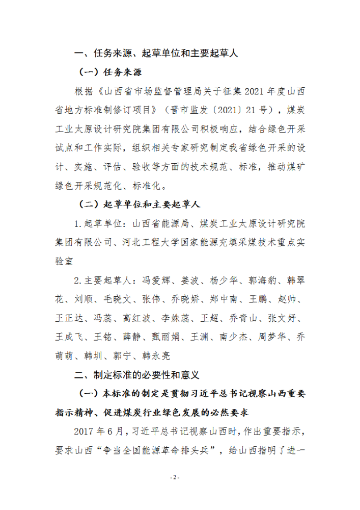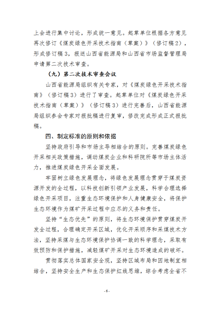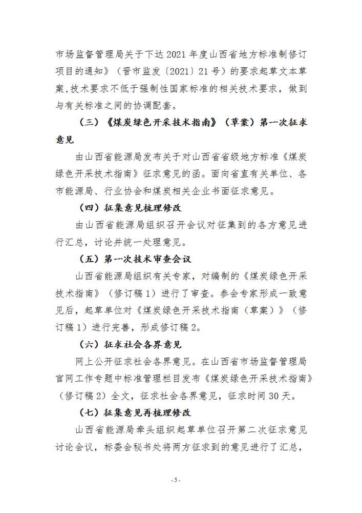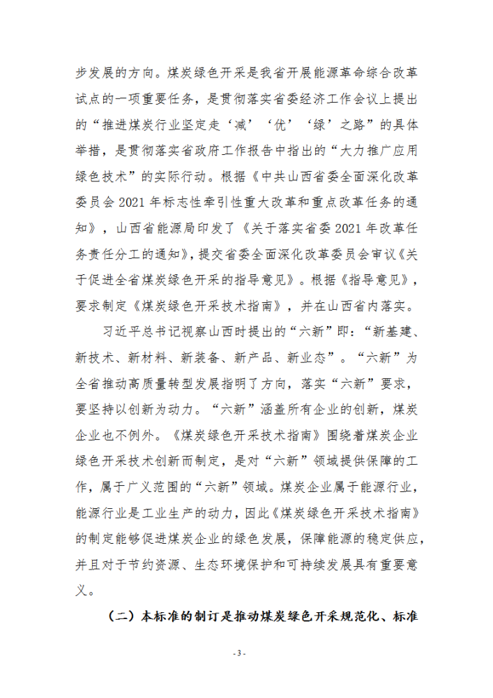 山西省發(fā)展和改革委員會、山西省科學技術廳、山西省財政廳、山西省自然資源廳、山西省生態(tài)環(huán)境廳、山西省水利廳、山西省應急廳、山西省文物局、山西省林業(yè)和草原局、國家稅務總局山西省稅務局,各市能源局,各相關企業(yè): 根據(jù)山西省市場監(jiān)督管理局《關于下達2022年度第二批山西省地方標準制修訂項目計劃的通知》(晉市監(jiān)發(fā)〔2022〕83號),我局組織起草了《煤炭綠色開采技術指南》(征求意見稿)以及編制說明。現(xiàn)就該標準征求貴單位意見,請于2022年6月6日前將書面意見反饋至我局(無意見也需反饋)。
