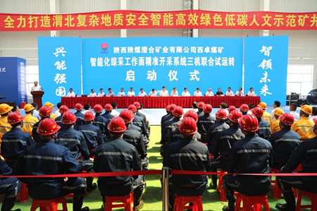 2022年6月14日上午,澄合礦業(yè)公司黨委書記、董事長葉東生下達開機指令,伴隨著乳化泵、刮板輸送機、采煤機的相繼啟動,機器運轉(zhuǎn)的隆隆轟鳴聲和熱烈持久的掌聲響徹全場,標志著澄合礦業(yè)公司西卓煤礦智能化綜采工作面地面聯(lián)合試運轉(zhuǎn)取得圓滿成功。此套設(shè)備將應(yīng)用于西卓煤礦首采工作面—1509智能化綜采工作面,天瑪智控承擔實施了支架電液控制系統(tǒng)和自動化控制系統(tǒng)部分。