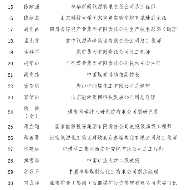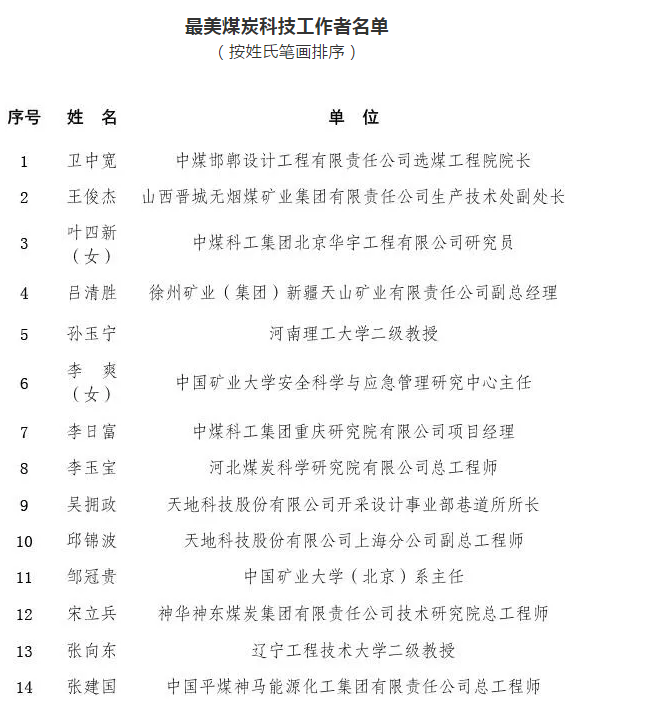 各有關(guān)單位: 在中華人民共和國成立70周年之際,為深入貫徹習(xí)近平新時(shí)代中國特色社會(huì)主義思想,大力實(shí)施創(chuàng)新驅(qū)動(dòng)發(fā)展戰(zhàn)略和人才強(qiáng)國戰(zhàn)略,激發(fā)廣大煤炭科技工作者的創(chuàng)新創(chuàng)造熱情,根據(jù)《中共中央宣傳部、中國科協(xié)、科技部、中國科學(xué)院、中國工程院、國防科工局關(guān)于開展2019年"最美科技工作者"學(xué)習(xí)宣傳活動(dòng)的通知》(科協(xié)發(fā)調(diào)字〔2019〕20號(hào)),中國煤炭學(xué)會(huì)開展了2019年最美煤炭科技工作者評(píng)選工作。 本次評(píng)選,煤炭企事業(yè)單位選拔推薦了104位候選人,學(xué)會(huì)組織了評(píng)審委員會(huì),通過初審、復(fù)評(píng)及公示,經(jīng)中國煤炭學(xué)會(huì)黨委和學(xué)會(huì)第七屆理事會(huì)2019年通訊會(huì)議通過,評(píng)選出最美煤炭科技工作者30名(附件),予以宣傳表彰。 30位受表彰者,來自煤炭科研生產(chǎn)一線和各專業(yè)領(lǐng)域。在他們身上體現(xiàn)了煤炭科技工作者愛黨愛國、甘于奉獻(xiàn)的社會(huì)主義價(jià)值觀,展示了勇于探索創(chuàng)新、艱苦攻關(guān)克難,甘為人梯育人的時(shí)代精神,具有良好的示范作用。希望廣大煤炭科技工作者以他們?yōu)榘駱?,做重大科研成果的?chuàng)造者、建設(shè)科技強(qiáng)國的奉獻(xiàn)者、崇高思想品格的踐行者、良好社會(huì)風(fēng)尚的引領(lǐng)者,為建設(shè)世界科技強(qiáng)國、實(shí)現(xiàn)中華民族偉大復(fù)興中國夢(mèng)作出更大貢獻(xiàn)。