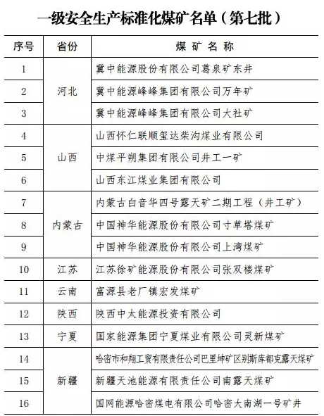 這16處煤礦達到一級安全生產(chǎn)標準化標準,正式公布