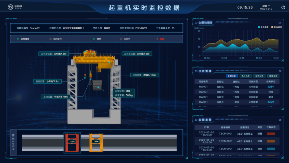 重型起重機智能化遠程控制項目結(jié)合煉鋼廠自動化、信息化、生產(chǎn)管理現(xiàn)狀,制定了“設備模型化、操作一鍵化”,實現(xiàn)了“視頻集控中心、行車集控中心”的“兩化兩中心”智慧制造實施方案。項目建立兩大集控中心,實現(xiàn)行車的遠程安全視頻監(jiān)控,并提供行車的狀態(tài)數(shù)據(jù)實時監(jiān)控、故障分析處理、數(shù)據(jù)采集、運行維護、生產(chǎn)統(tǒng)計和整體設備使用狀況分析,形成具備“自動巡航、整車集控,遠程監(jiān)控,地面遙控”等功能的智能化行車系統(tǒng),形成了智能煉鋼廠生產(chǎn)管理新模式。目前,項目研究成果已成功應用于山西晉南鋼鐵集團。