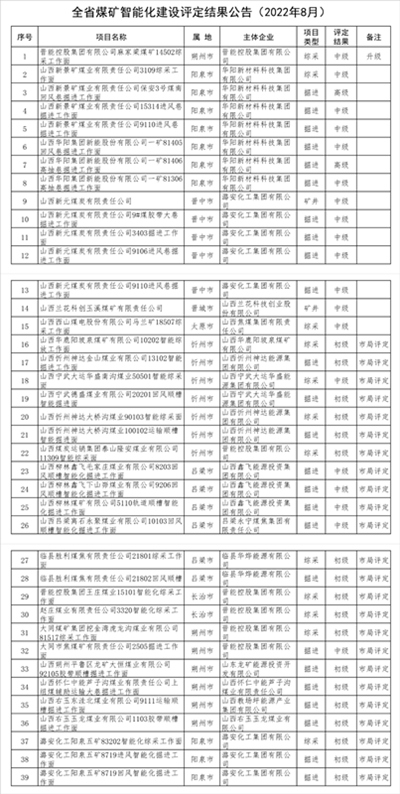 經(jīng)朔州市、陽泉市等能源局申請,省能源局按照規(guī)定組織專家對晉能控股集團有限公司麻家梁煤礦14502綜采工作面等15個智能化建設(shè)項目進行了現(xiàn)場評定;忻州市、呂梁市等能源局按文件規(guī)定對山西華鹿陽坡泉煤礦有限公司10202智能綜放工作面等24個煤礦智能化建設(shè)項目進行了現(xiàn)場評定,現(xiàn)將符合《全省煤礦智能化建設(shè)基本要求及評分方法(試行)》的智能化項目予以公告。
