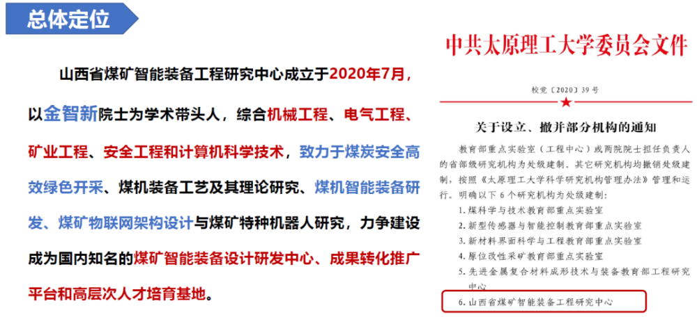 編者按:煤炭工業(yè)高質量發(fā)展是保障我國能源安全的一項重要舉措,而智能化煤礦建設是實現(xiàn)工業(yè)高質量發(fā)展的關鍵與核心所在。加快智慧礦山、智能化煤礦建設是煤炭工業(yè)邁向高質量發(fā)展的“新引擎”。自國家政策明確大力發(fā)展煤礦智能化以來,“智能化”主題成為各大煤業(yè)研究所和院校的主要研究方向。本期將簡單介紹太原理工大學山西省煤礦智能裝備工程研究中心,期望促進產學研交流,成果轉化等。