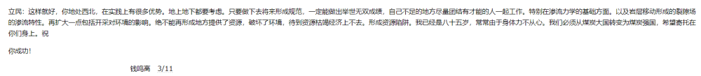 我與錢老師只見過兩次面,加起來只有150分鐘,但就是這150分鐘,他嚴(yán)謹(jǐn)?shù)闹螌W(xué)精神,敏銳的科學(xué)洞察力和對(duì)祖國(guó)煤炭事業(yè)的關(guān)心,對(duì)青年人的成長(zhǎng),都給我留下深刻印象。