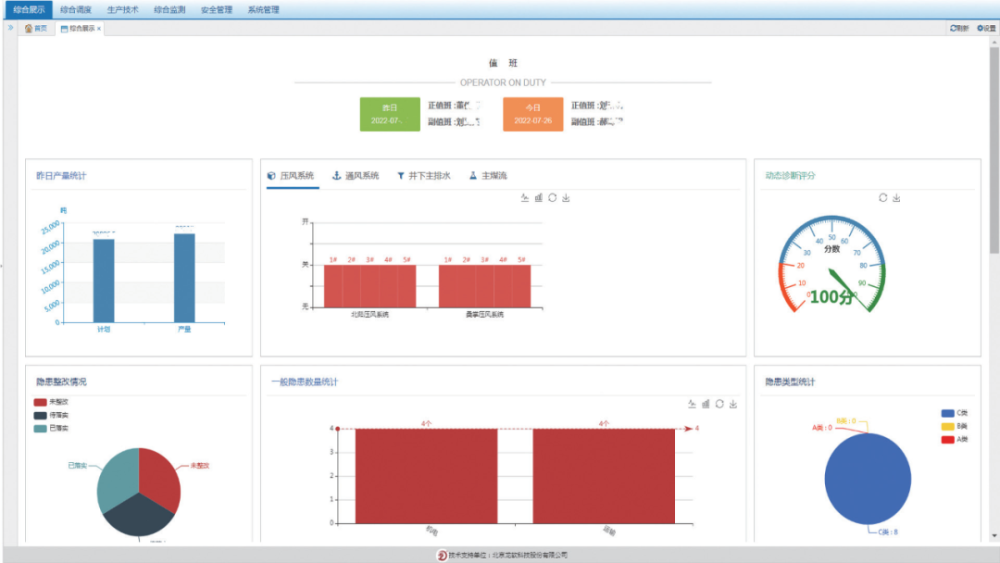 在基礎(chǔ)設(shè)施建設(shè)方面,構(gòu)建了數(shù)據(jù)中心、調(diào)度大屏、切片分組工業(yè)環(huán)網(wǎng)等;在專業(yè)子系統(tǒng)建設(shè)方面,建設(shè)了地測、通防、調(diào)度、機(jī)電等專業(yè)應(yīng)用系統(tǒng),安全監(jiān)控、頂板壓力、水文監(jiān)控、人員管理等監(jiān)測監(jiān)控系統(tǒng),主副提升、輸送帶運(yùn)輸、水泵房、變電所等生產(chǎn)自動(dòng)化監(jiān)控系統(tǒng),以及井下廣播、無線通信系統(tǒng)等調(diào)度通信聯(lián)絡(luò)類系統(tǒng)。