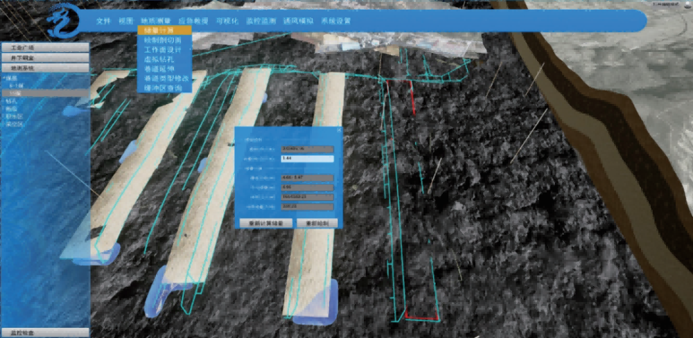 (3)在礦井地質(zhì)模型基礎(chǔ)上,重點(diǎn)進(jìn)行采掘工作面多源數(shù)據(jù)集成與融合分析,基于地質(zhì)勘查數(shù)據(jù)、井巷工程數(shù)據(jù)、井上井下鉆探、物探等數(shù)據(jù),開發(fā)采掘工作面空間數(shù)據(jù)集成管理和高精度三維可視化系統(tǒng),構(gòu)建高精度采掘工作面模型,通過高精度三維地質(zhì)模型局部動(dòng)態(tài)修正技術(shù),提高工作面地質(zhì)模型的精度,為智能開采工作面的建設(shè)提供基礎(chǔ)的地理信息透明平臺支撐。華陽二礦地質(zhì)保障系統(tǒng)預(yù)期建設(shè)效果如圖2所示。
