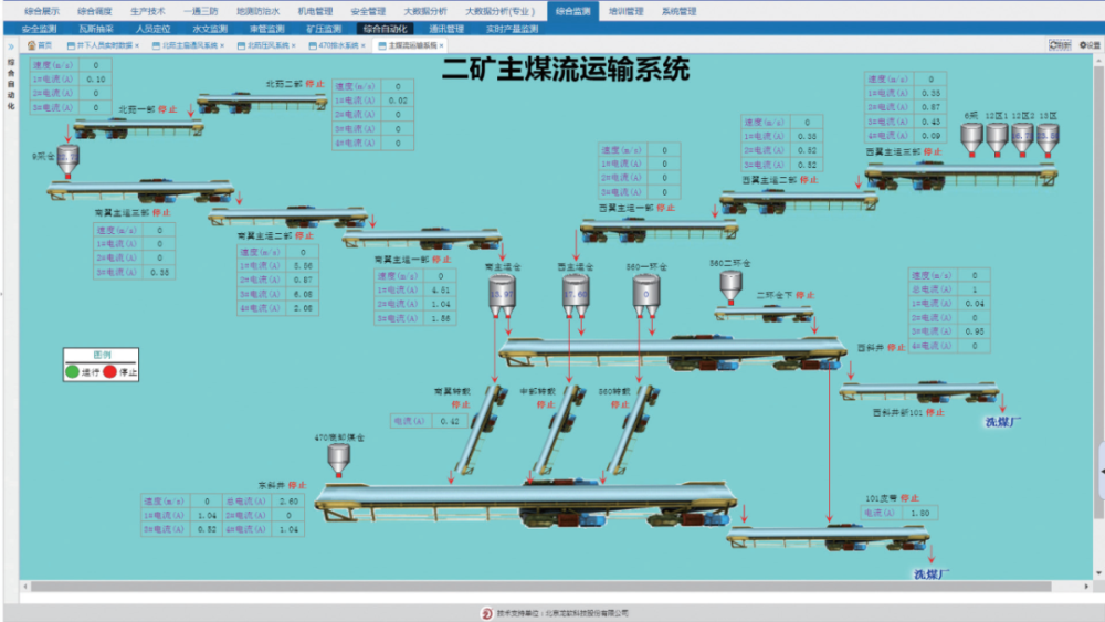 華陽二礦主運(yùn)輸系統(tǒng)及主提升系統(tǒng)均采用帶式輸送機(jī)運(yùn)輸方式。主運(yùn)輸系統(tǒng)由西主運(yùn)帶式輸送機(jī)及南主運(yùn)帶式輸送機(jī)系統(tǒng)組成,運(yùn)輸系統(tǒng)完善,且均已完成集控改造;主提升系統(tǒng)由東斜井帶式輸送機(jī)提升系統(tǒng)及西斜井帶式輸送機(jī)提升系統(tǒng)組成,且均已完成集控改造。主運(yùn)輸系統(tǒng)及主提升系統(tǒng)單條帶式輸送機(jī)具備完善的傳感器、執(zhí)行器及控制器,能夠?qū)崿F(xiàn)單設(shè)備的自動(dòng)控制,具備完善的綜合保護(hù)裝置,裝設(shè)有防打滑、跑偏、堆煤、撕裂、斷帶、超速、輸送帶張緊力下降等保護(hù)裝置。此外,裝設(shè)溫度、煙霧監(jiān)測裝置和自動(dòng)灑水裝置,具備沿線急停閉鎖功能和遠(yuǎn)程監(jiān)控功能。但是,華陽二礦主運(yùn)輸系統(tǒng)及主提升系統(tǒng)的集控系統(tǒng)相互獨(dú)立,沒有全運(yùn)輸流程的集控系統(tǒng),無法對主運(yùn)輸全過程進(jìn)行集中協(xié)同控制。