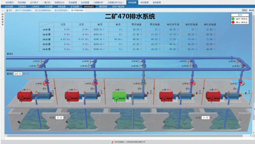 水泵房新增1套煤礦井下排水自動(dòng)化控制系統(tǒng)進(jìn)行集控。信號接入工業(yè)環(huán)網(wǎng)至地面上位機(jī)排水管理系統(tǒng),系統(tǒng)利用數(shù)據(jù)中心服務(wù)器進(jìn)行組網(wǎng),接入礦山綜合管控平臺,以實(shí)現(xiàn)遠(yuǎn)程控制、無人值守。華陽二礦排水系統(tǒng)預(yù)期建設(shè)效果如圖5所示。