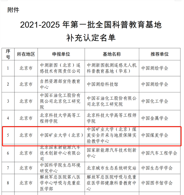 近日,中國(guó)科協(xié)公布了2021-2025年第一批全國(guó)科普教育基地補(bǔ)充認(rèn)定名單,經(jīng)中國(guó)煤炭學(xué)會(huì)推薦、中國(guó)科協(xié)評(píng)審、面向社會(huì)公示等程序,我校能源與礦業(yè)學(xué)院“煤炭安全開(kāi)采與地質(zhì)保障實(shí)驗(yàn)教學(xué)中心”成功獲批全國(guó)科普教育基地。